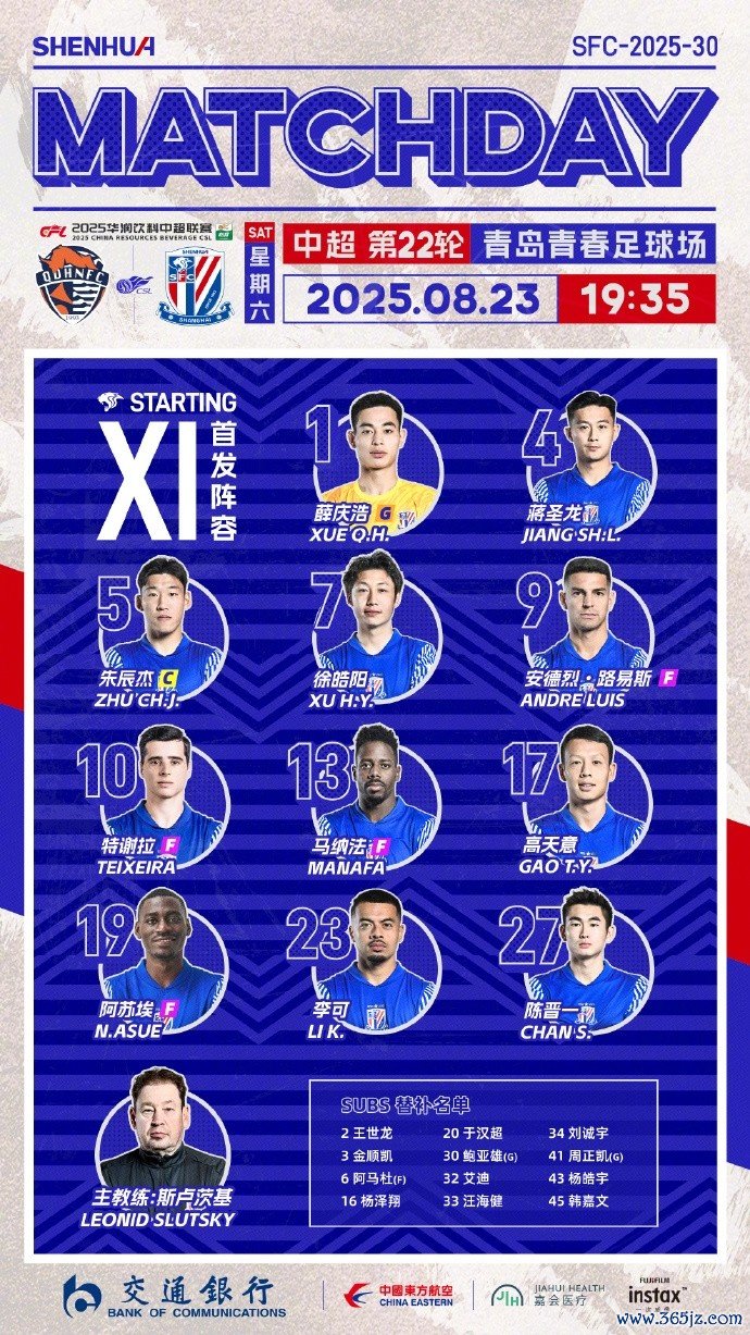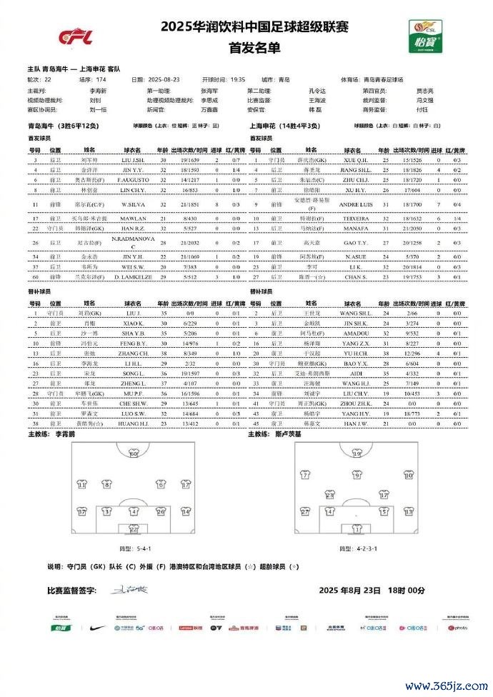 2025中超职业联赛 第22轮 青岛海牛 vs 上海申花 杆位名单