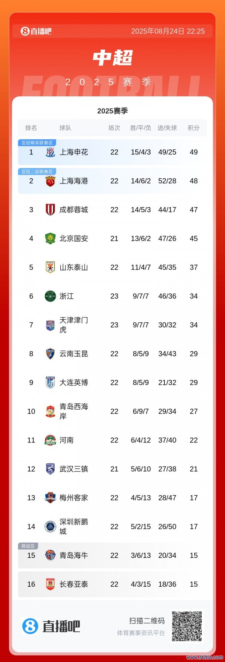 08月24日讯 中超第22轮今日结束多场较量,上海海港主场作战 1-1战平天津津门虎,梅州客家2-2浙江队,游泳快讯长春亚泰1-0深圳新鹏城, 摩纳哥西甲直播河南4-0大连英博, 羽毛球资讯山东泰山3-2青岛西海岸皇马11-1巴萨,最新中超积分榜如图。