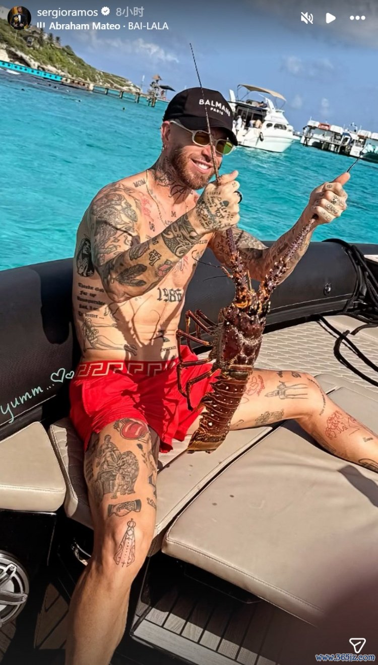 8月26日讯 拉莫斯在个人社媒晒出自己假期休憩 的照片,并与捕获的龙虾合影。