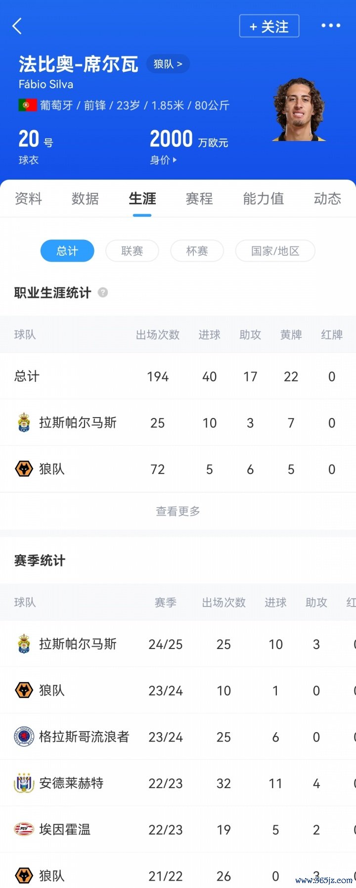 法比奥-席尔瓦现年23岁,游泳快讯2020年以4000万欧元转会费从波尔图加盟狼队,此后被多次外租。席尔瓦共为狼队出战72次打入5球6助功 ,上赛季他效力拉斯帕尔马斯,出场25次打入10球3助功 。
