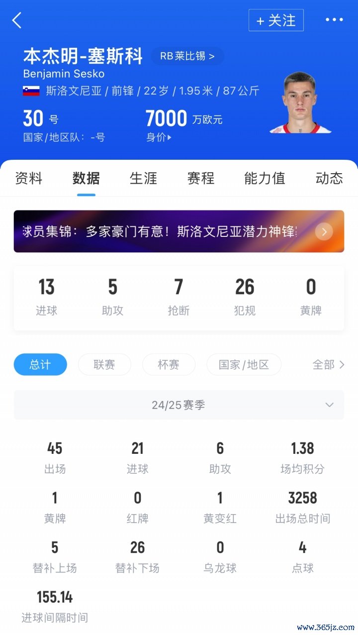 塞斯科现年22岁,上赛季为莱比锡出场45次,取得21粒得分 和6次助功 ,目前其德回转 价为7000万欧元。