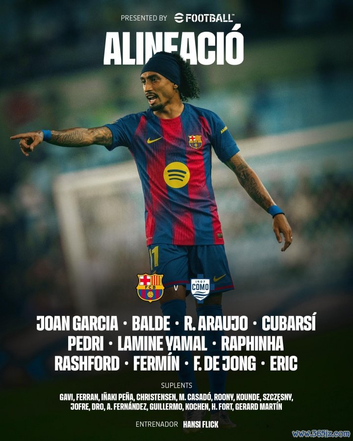 巴塞罗那杆位:霍安-加西亚、巴尔德、阿劳霍、库巴西、埃里克-加西亚、佩德里、费尔明、德容、亚马尔、拉菲尼亚、拉什福德