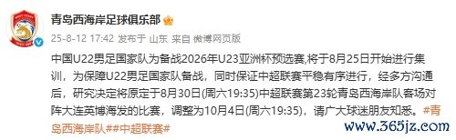 08月12日讯 青岛西海岸官方宣布,为保障U22男足国家队准备比赛 ,同时保证中超职业联赛 平稳有序进行,原定8月30日大连英博主场作战 vs西海岸赛事 ,改期至10月4日进行。