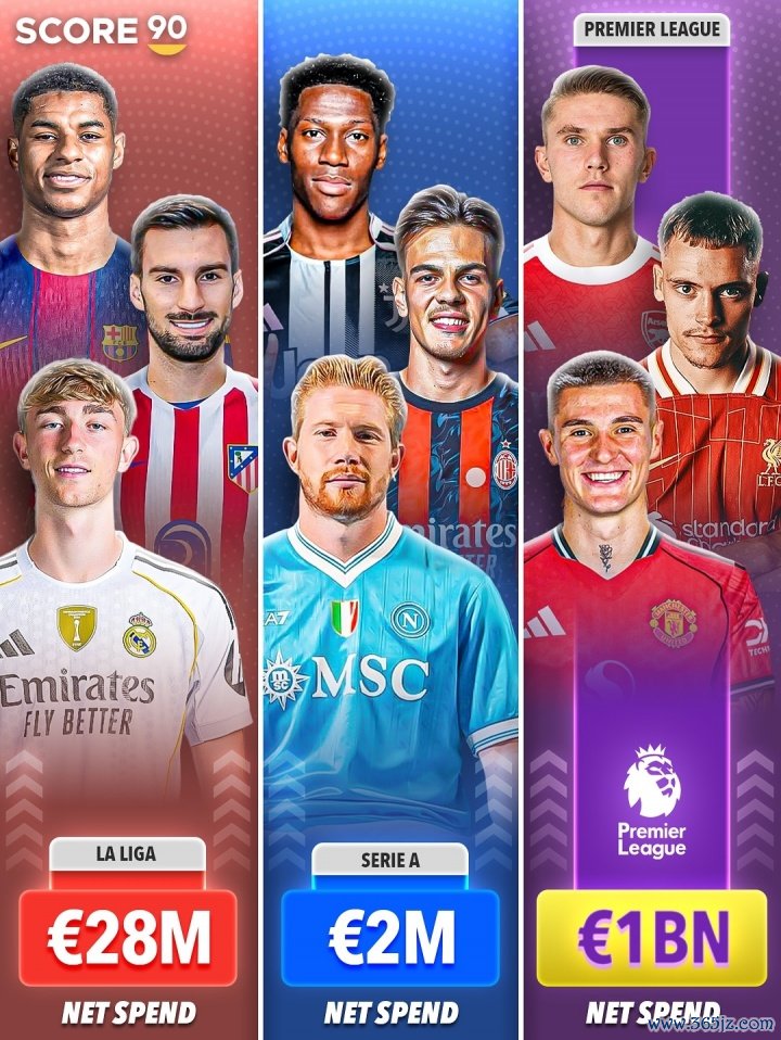 08月12日讯 外媒SCORE90统计了欧洲四大职业联赛 在夏季转会窗的收支情况,英超以10亿欧元的净支出遥遥领跑 ,西甲净支出2800万欧元,意甲200万欧元,德甲则在转会市场上净赚1.4亿欧元。
