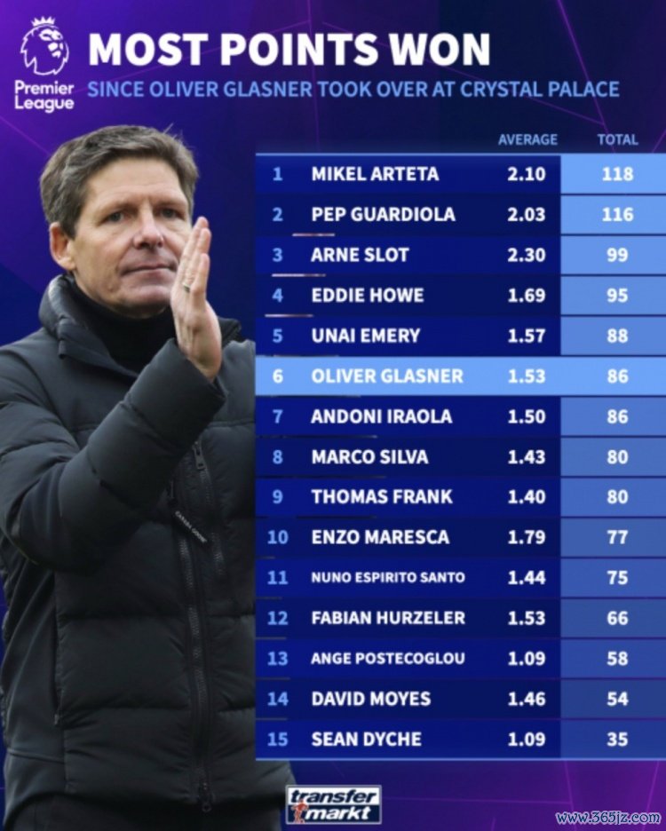 9月27日讯 据德国《转会市场》统计,水晶宫主帅格拉斯纳上任以来,水晶宫在英超的场均得分1.53分,排名第六位,本赛季水晶宫是英超丢球最少的球队。