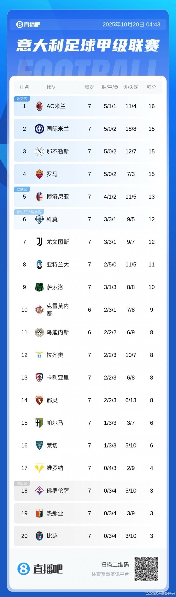 国米、那不勒斯、罗马均为15分免费英超直播, 羽毛球资讯足球直播吧排名第2名-第4名。博洛尼亚13分第5,游泳快讯科莫、尤文12分排名第6和第7。