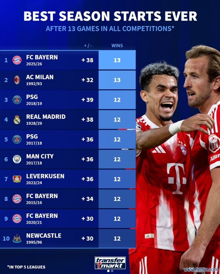 德转列五大联赛球队赛季前13场最佳开局:拜仁&92年米兰并列居首