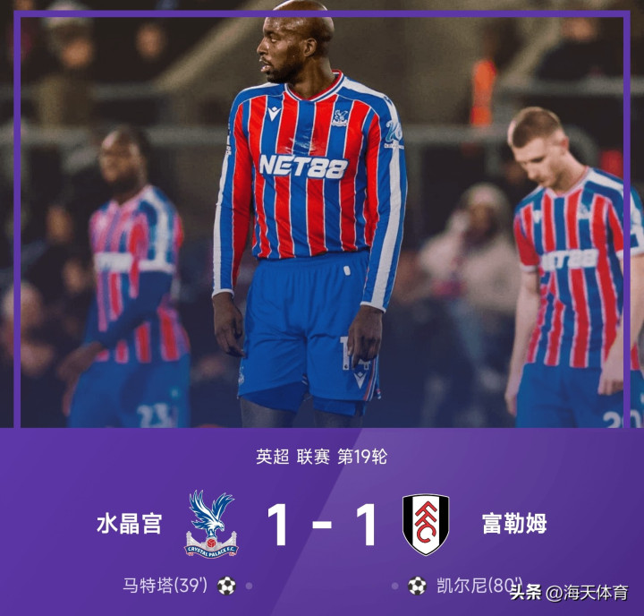 全场比赛:第24分钟,富勒姆左路传中,禁区中头球摆渡,后点威尔逊抽射被扑出,希门尼斯凌空补射打偏了,第39分钟,水晶宫右路攻势,克莱因过掉上抢的对手,杀到禁区右侧边缘,传中到小禁区内,马特塔头槌破门!水晶宫1-0领先富勒姆,第80分钟,卢基奇禁区前分球,弧顶位置凯尔尼左脚抽射破门!随后脱衣庆祝!富勒姆1-1扳平水晶宫,伤停补时90+2分钟,希门尼斯禁区内做球,凯尔尼的传球被挡了一下,刚好落在卡斯塔涅面前,卡斯塔涅绝佳的绝杀机会!被迪恩·亨德森神奇扑出,